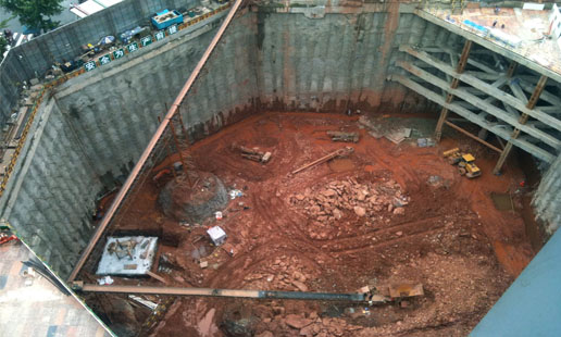 四川航空廣場超深基坑支護工程,基坑周長約250米,地下6層,基坑深度28.5米(主樓核心筒達30米),是成都市有史以來最深基坑之一。設計采用排樁+預應力錨索+內支撐相結合的圍護體系, 護壁樁樁徑1.5米,樁距2.0米,樁長34米,樁數131根;鋼構立柱樁9根,樁長33米;預應力錨索6排;內支撐3處、縱向4層;降水井13口;土、石方挖運約13萬立方米。工程于2012年12月竣工驗收。