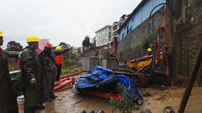 10月9日,施工組冒雨開孔施工,截止晚上7點,完成3根鋼管樁的成孔工作。我院迅速的救災(zāi)反應(yīng)、高度的社會責(zé)任感、精干的搶險隊伍和過硬的施工組織能力深受木里縣委縣政府領(lǐng)導(dǎo)和社會各界好評。并于10月10日專門邀請甘孜州日報對施工現(xiàn)場進行采訪報道,截止目前專題報道尚在編制中。堅信在省廳、州委、縣委縣政府以及縣國土局的指揮和支持下,通過我院精心組織,精心施工,定能高效優(yōu)質(zhì)的完成畜牧局東側(cè)滑坡的應(yīng)急搶險工程,確保木里縣城居民生命安全,還木里一個安全舒適的居住環(huán)境。(巖土工程公司 張繼)