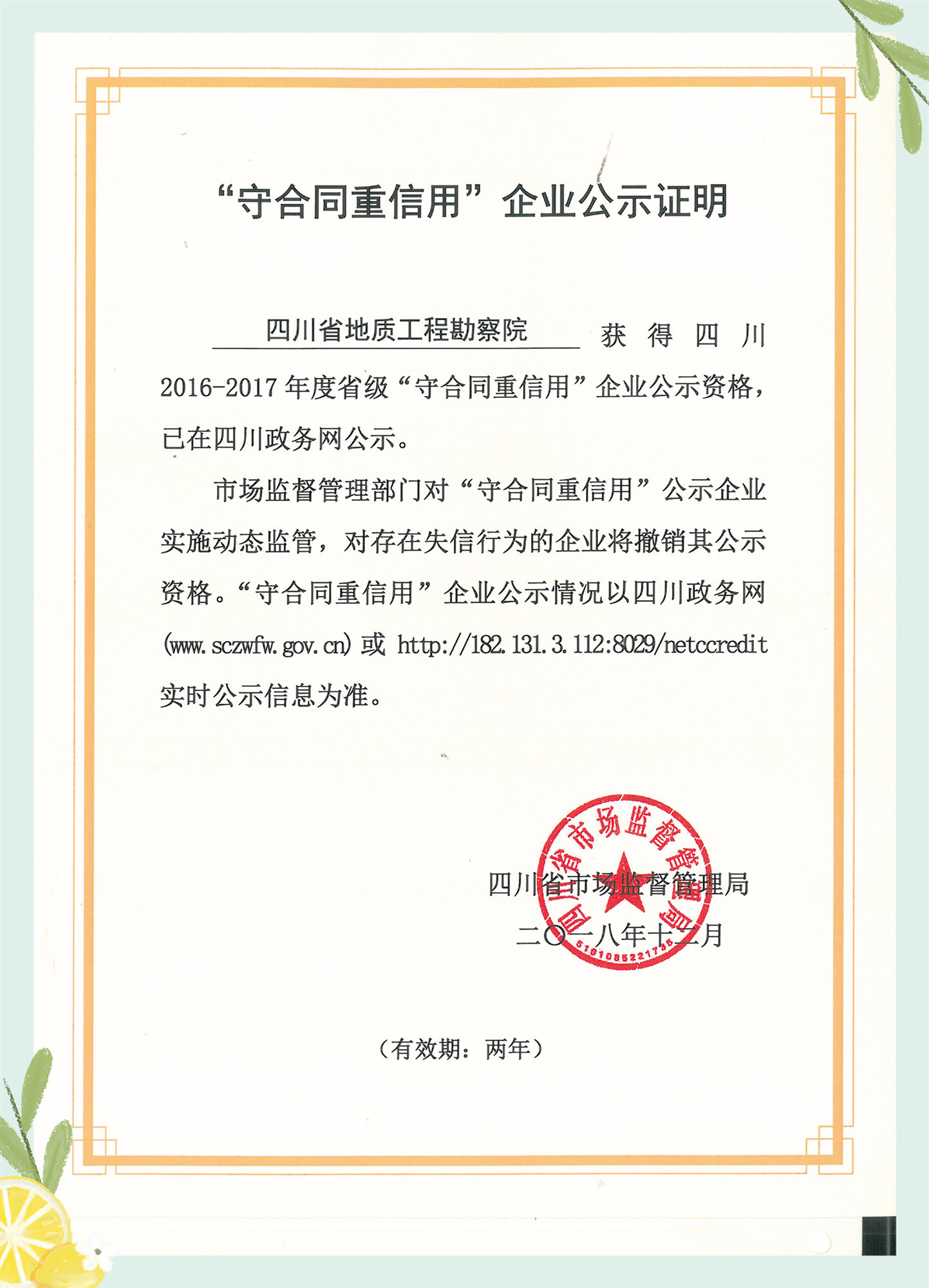 近日,經(jīng)四川省市場(chǎng)監(jiān)督管理局評(píng)比公示,我院再次獲得四川省“守合同重信用”企業(yè)稱號(hào)。我院自2006年開始參與“守合同重信用”企業(yè)的評(píng)選活動(dòng)以來(lái),至今已連續(xù)12年未間斷獲評(píng)“守合同重信用”企業(yè)。